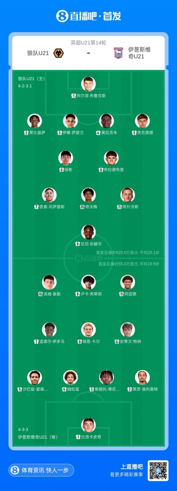 狼队U21首发:1-布鲁克斯、2-莱比基萨、3-萨瑟兰、4-奥拉贡朱、5-洛赫黑德、6-徐彬、8-布拉德布里、7-冈萨雷斯、10-奇沃梅、11-阿什沃斯、9-安赫尔