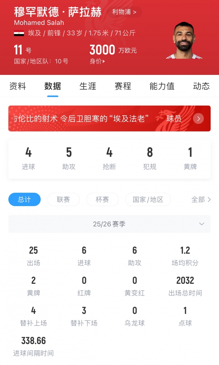 萨拉赫现年33岁,他本赛季为利物浦出场25次,贡献6球6助,他现身价3000万欧,周薪40万镑,他与利物浦的合同明夏到期。