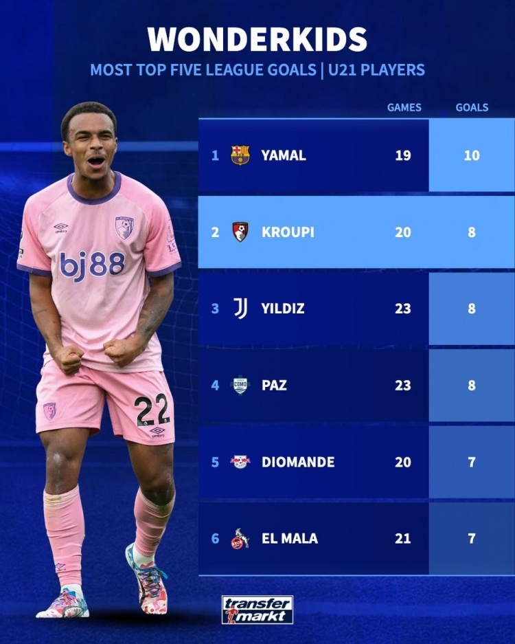 2月10日讯 《转会市场》统计了本赛季五大联赛U21球员进球情况,18岁的亚马尔居首。本赛季五大联赛U21进球榜:亚马尔(巴萨),19场,10球克鲁皮(伯恩茅斯),20场,8球伊尔迪兹(尤文),23场,8球帕斯(科莫),23场,8球扬·迪奥曼德(莱比锡),20场,7球萨义德·马拉(科隆),21场,7球