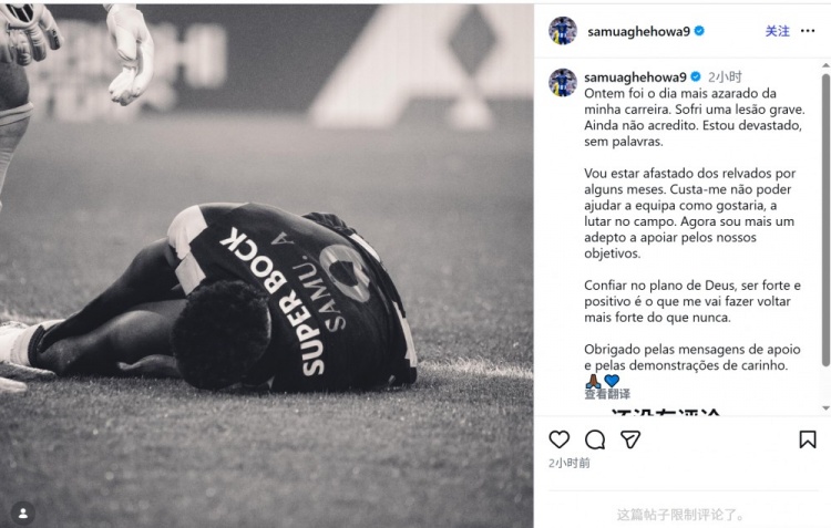 2月11日讯 波尔图前锋阿格霍瓦右膝扭伤,伴有前交叉韧带损伤,他在社交媒体上发文,谈到了自己的伤情。阿格霍瓦社媒写道:“昨天是我职业生涯中最不幸的一天。我受了重伤。我仍然不敢相信。我感到非常沮丧,不知所措。我将离开球场几个月,无法像自己希望的那样帮助球队,无法在球场上奋战,这让我感到非常痛苦。现在我只能像一名普通球迷一样,在场外支持球队实现我们的共同目标。相信上帝的安排,保持坚强和积极的心态,这将使我比以往更加强大地回归。感谢大家的支持信息和关怀。”