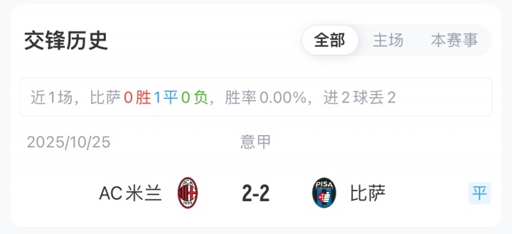 米兰联赛14胜8平1负积50分暂位意甲第2,目前在联赛已连续22场不败;比萨联赛1胜12平11负,目前已连续13场不胜。米兰首回合对阵比萨主场2-2战平。