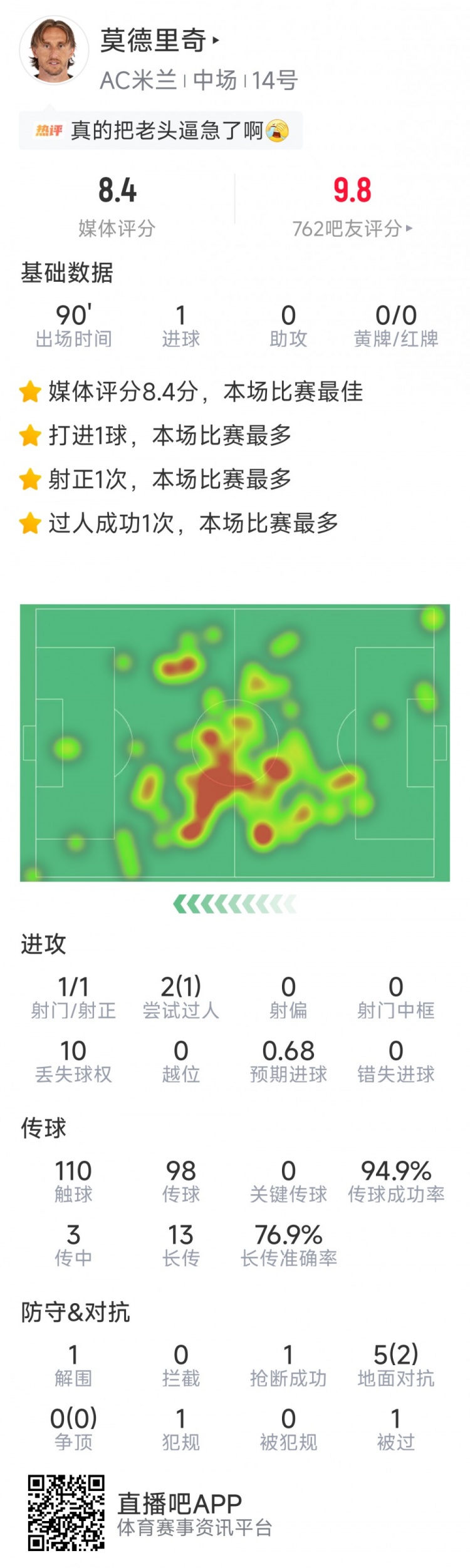 莫德里奇本场数据:1粒进球,1次射门,传球成功率95%,评分8.4分