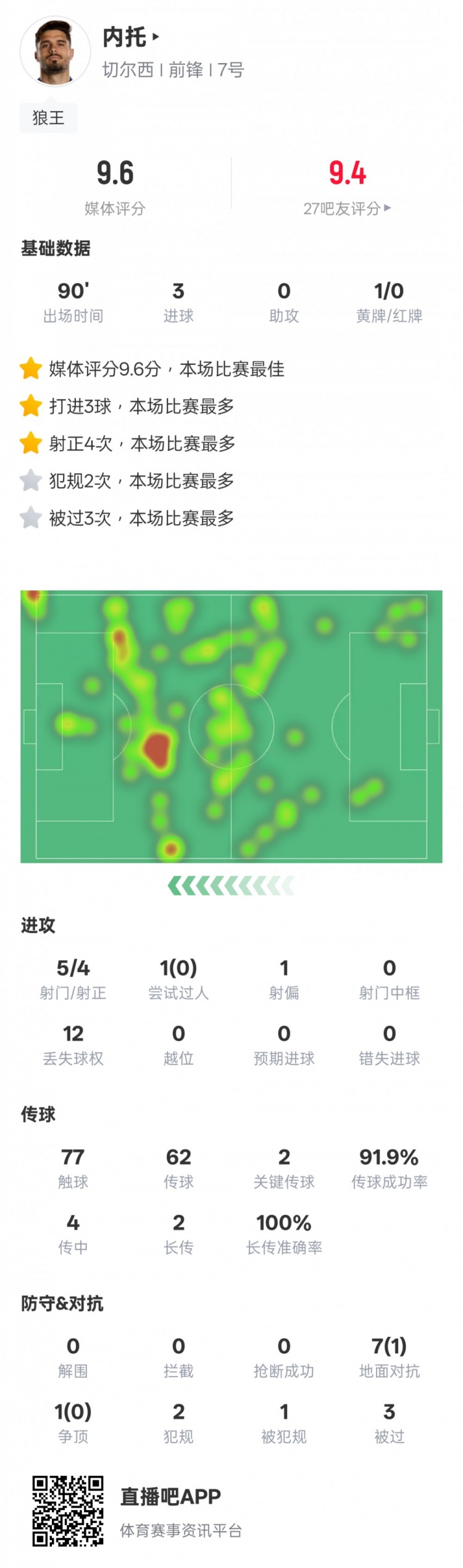 2月14日讯 足总杯第4轮,切尔西4-0战胜赫尔城。内托本场首发出战,上演帽子戏法,另外他还送出2次关键传球,评分9.6全场最高。内托本场比赛数据:进球3助攻0射门5射正4过人1过人成功0射偏1丢失球权12触球77传球62关键传球2传球成功率91.9%传中4长传2长传准确率100%地面对抗7地面对抗成功1争顶1争顶成功0犯规2被犯规1被过3