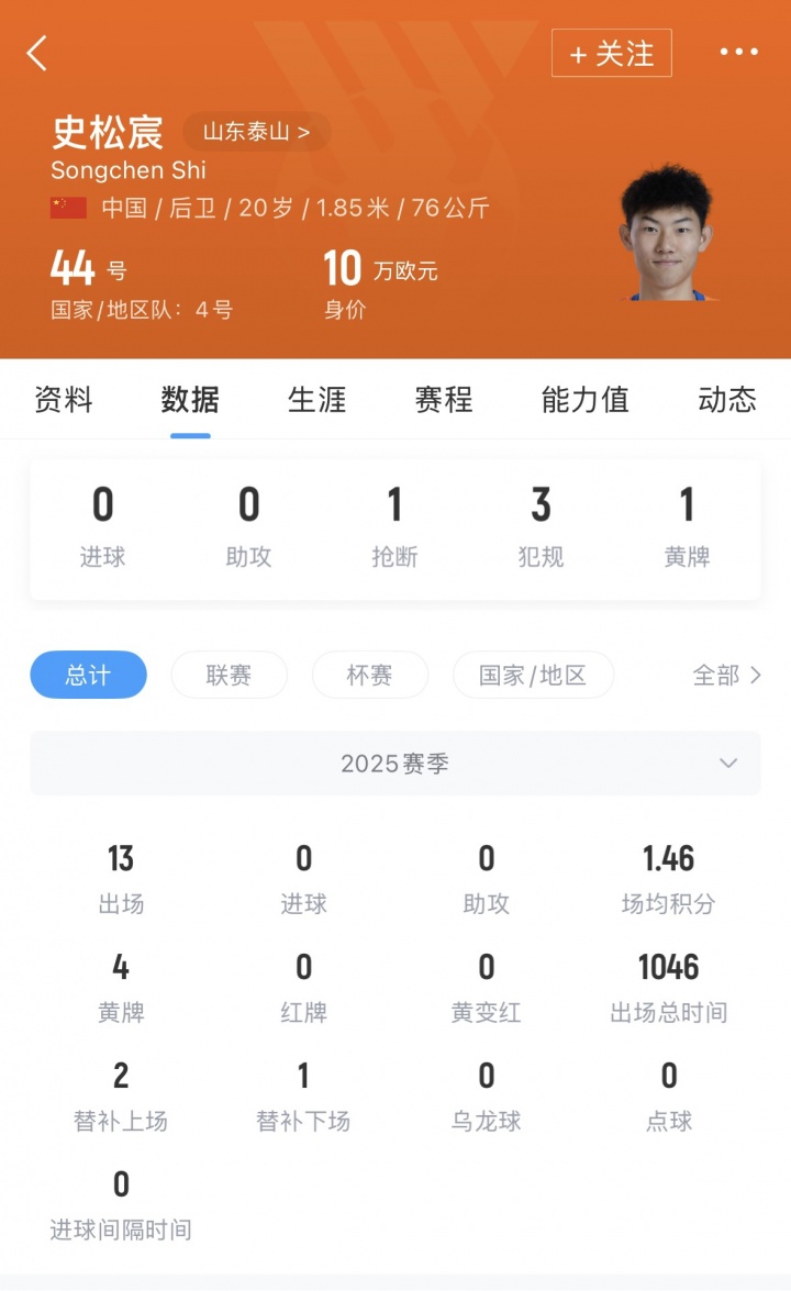 史松宸出自泰山青训,司职后卫,防守稳健、球商出众。上赛季史松宸在职业赛场稳步历练,中乙联赛出场10次、中超联赛出场3次,用踏实态度不断提升自我。