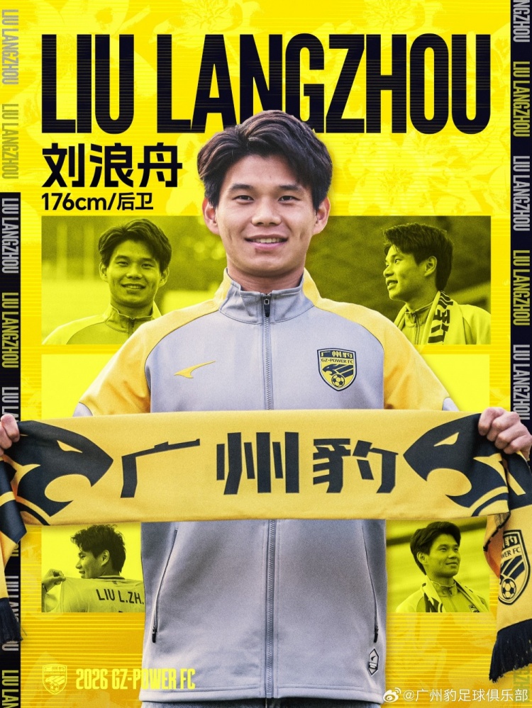 官方:23岁边卫刘浪舟加盟广州豹,曾效力广州和青岛西海岸等队