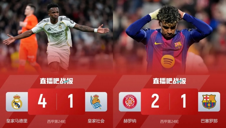 皇马凭借着近期的8连胜,超过巴萨登顶西甲。同时期,巴萨在近8轮比赛中有2负,分别是1-2不敌皇家社会以及本轮1-2不敌赫罗纳。