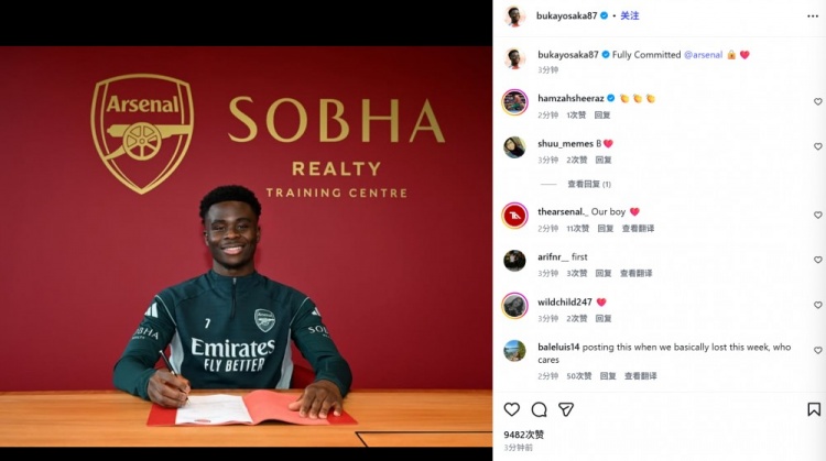 枪手青训出品!萨卡社媒晒签字照纪念续约:完全忠于阿森纳