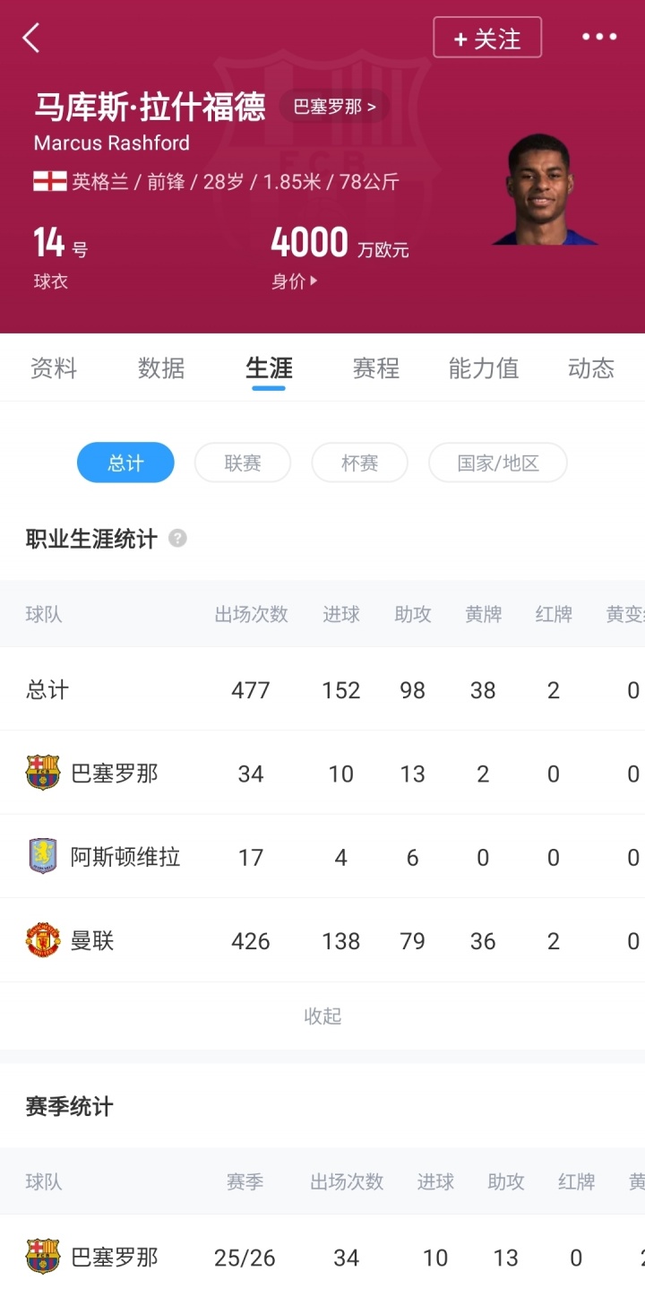 28岁的拉什福德本赛季代表巴萨出战34场比赛,贡献10球13助,目前德转身价4000万欧。