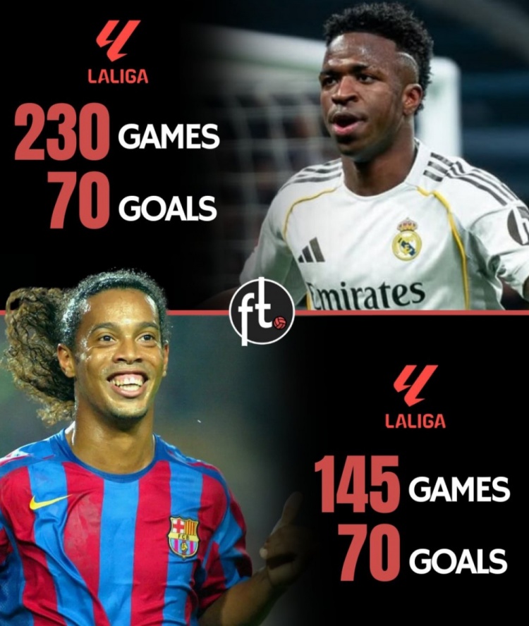 2月22日讯 西甲第25轮比赛,皇马在客场以1-2的比分不敌奥萨苏纳。本场比赛,维尼修斯为皇马打进1球。维尼修斯在西甲中已经打进70球,追平了同胞罗纳尔迪尼奥的进球数量。但是,巴萨传奇要比他少用85场比赛。
