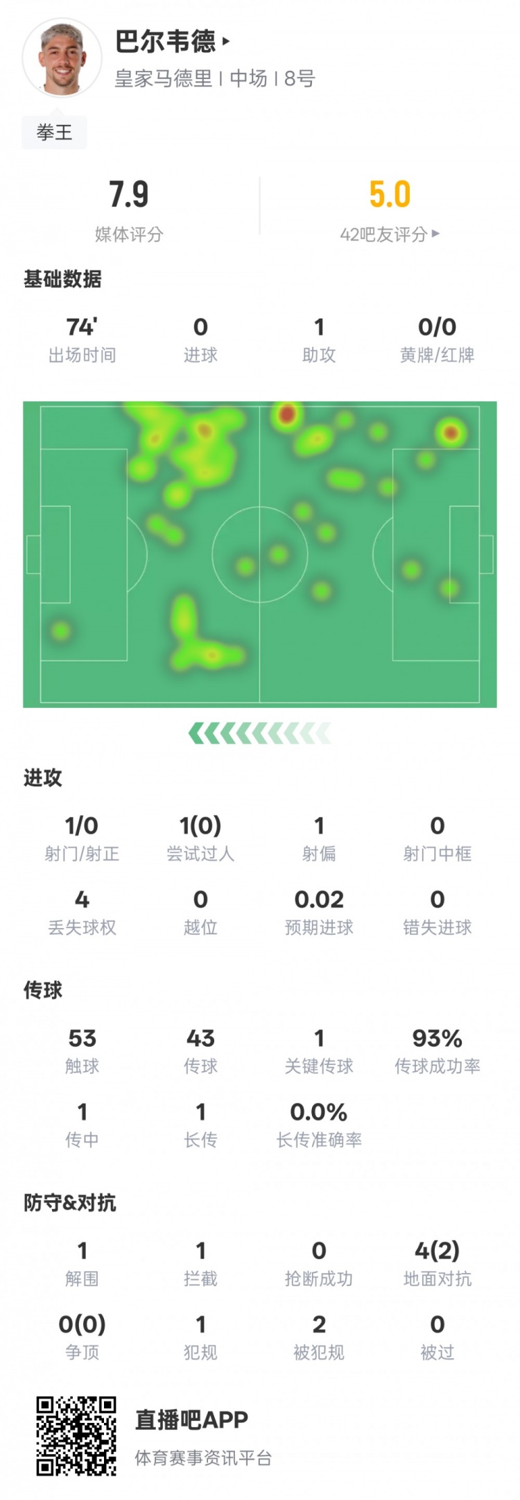 2月22日讯 西甲第25轮,皇马客战奥萨苏纳。巴尔韦德首发出战,送出1次助攻,1次关键传球,还有1次解围和1次拦截,传球成功率93%,评分7.9。巴尔韦德本场比赛数据如下:进球0助攻1射门1射正0过人1过人成功0丢失球权4触球53传球43关键传球1传球成功率93%传中1长传1解围1拦截1地面对抗4地面对抗成功2犯规1被犯规2