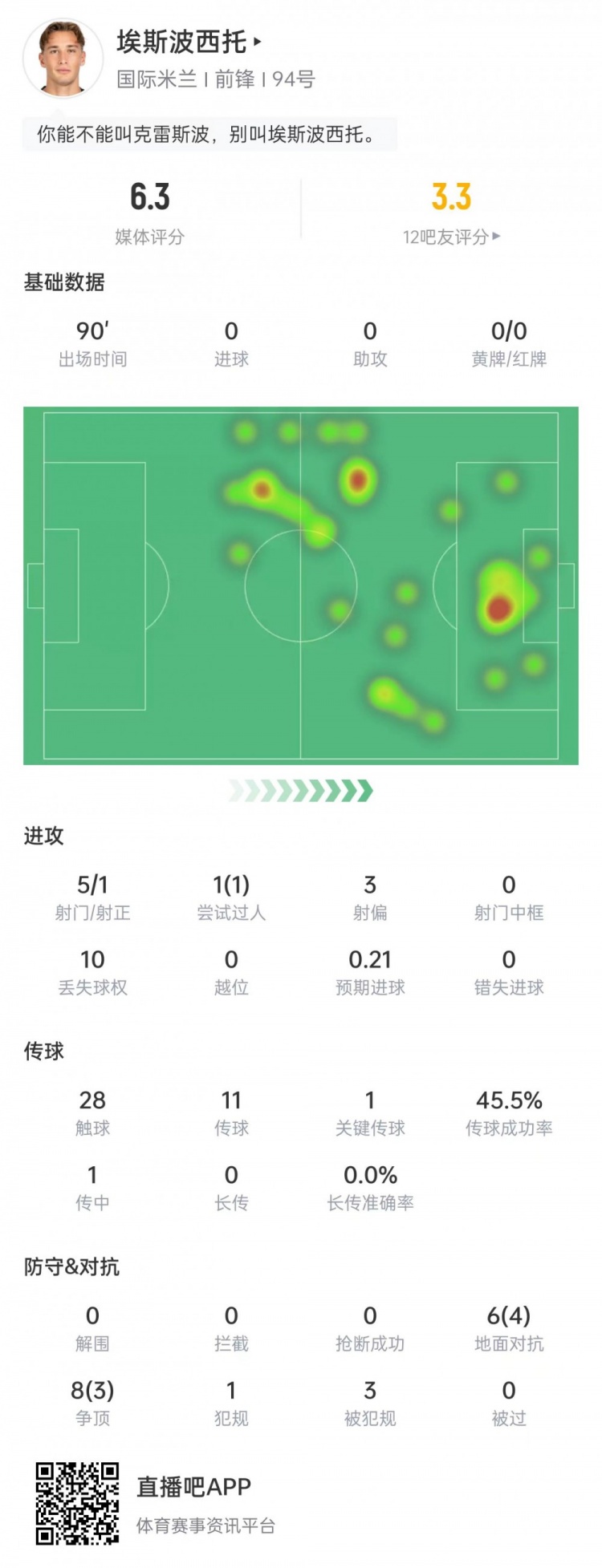 2月25日讯 欧冠淘汰赛附加赛次回合比赛,皮奥·埃斯波西托踢满全场,国米主场1-2不敌博德闪耀,总比分2-5出局。埃斯波西托数据:出场时间——90分钟射门——5(射正1)射偏——3尝试过人——1(成功1)丢失球权——10预期进球——0.21触球——28传球——11关键传球——1传球成功率——45.5%传中——1地面对抗——6(成功4)争顶——8(成功3)犯规——1被犯规——3媒体评分——6.3