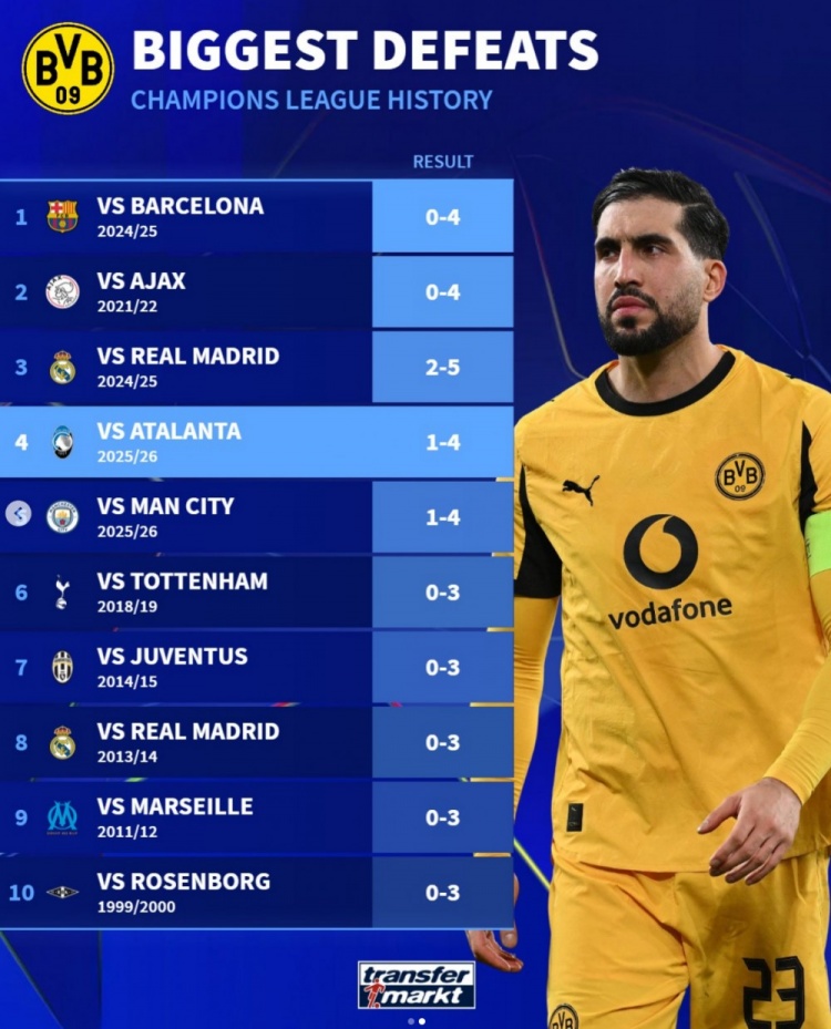 2月27日讯 在欧冠淘汰赛附加赛次回合,多特1-4不敌亚特兰大,总比分3-4被淘汰。德转也盘点了多特在欧冠最大比分失利榜单,具体如下:24/25赛季,0-4巴萨21/22赛季,0-4阿贾克斯24/25赛季,2-5皇马25/26赛季,1-4亚特兰大25/26赛季,1-4曼城18/19赛季,0-3热刺14/15赛季,0-3尤文13/14赛季,0-3皇马11/12赛季,0-3马赛99/00赛季,0-3罗森博格