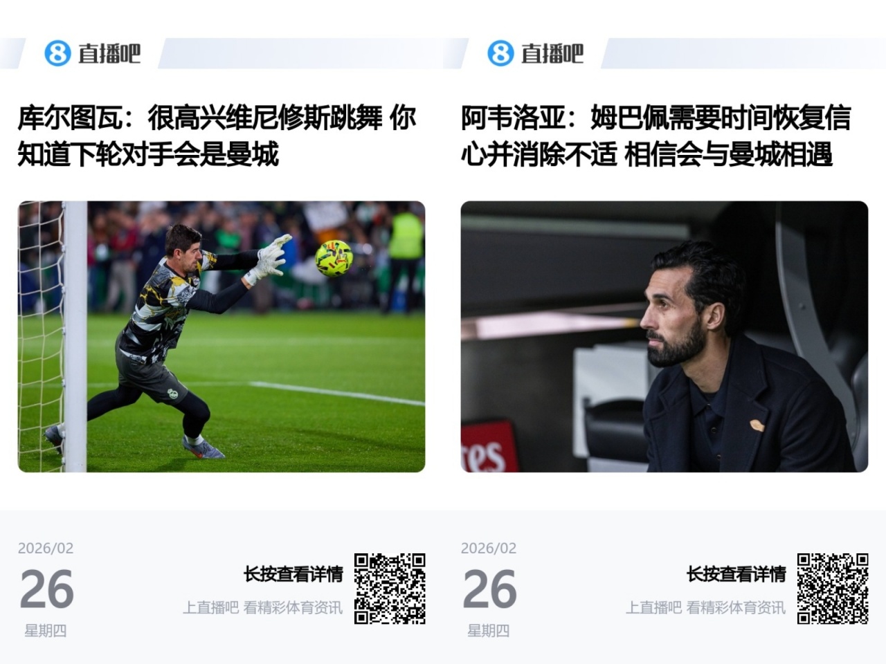 02月27日讯 欧冠淘汰赛抽签结果出炉,曼城再次抽中皇马,两队连续五年在欧冠中相遇。值得一提的是,此前在晋级欧冠16强后,皇马主帅阿韦洛亚和门将库尔图瓦接受采访时,就表示相信会再次抽到曼城。【相关阅读】库尔图瓦:很高兴维尼修斯跳舞 你知道下轮对手会是曼城阿韦洛亚:姆巴佩需要时间恢复信心并消除不适 相信会与曼城相遇