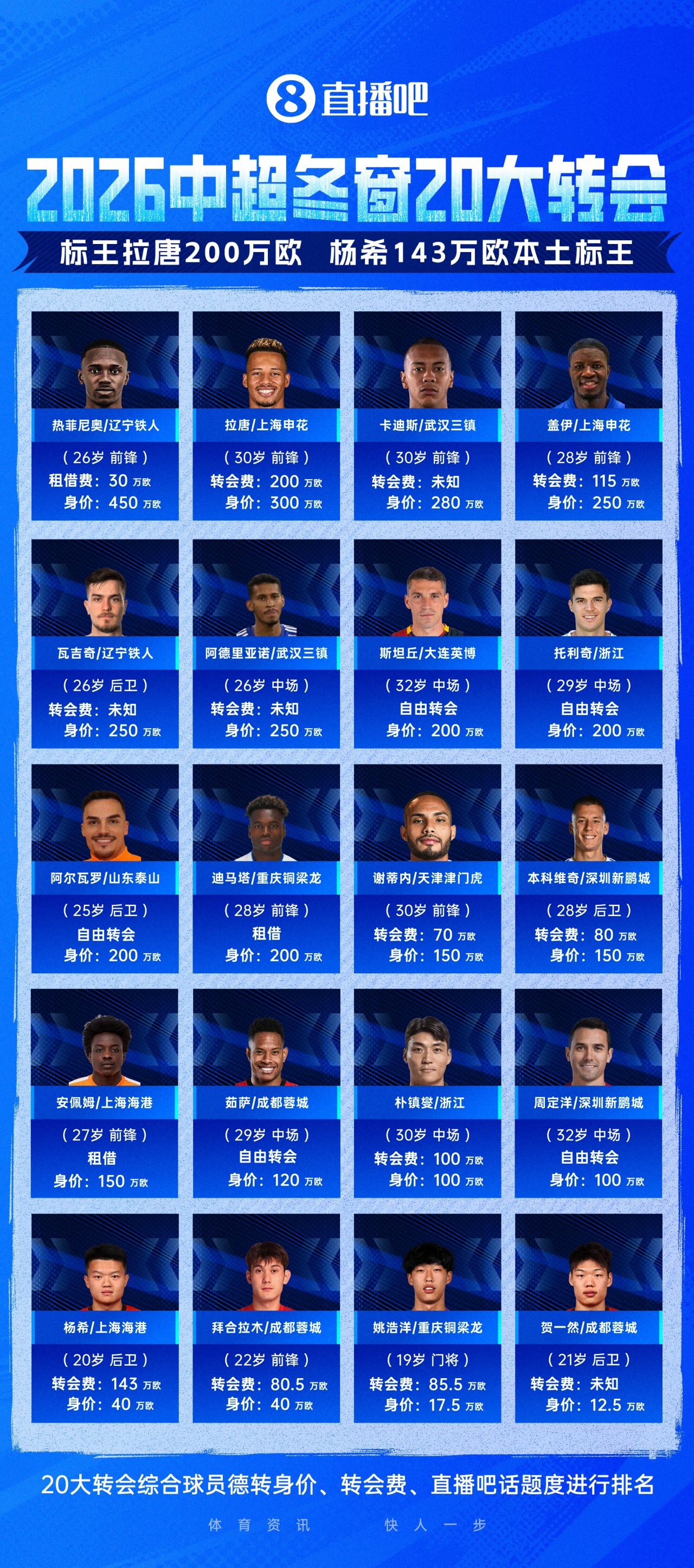 2026中超冬窗TOP20转会:拉唐200万欧标王,杨希143万欧本土标王