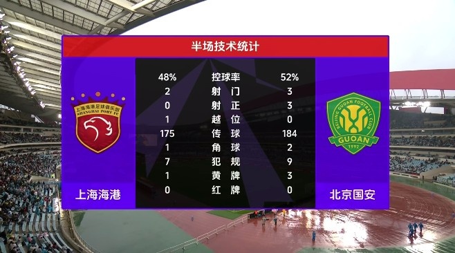 上海海港0-1北京国安半场数据:射门2-3、射正0-3、控球率48%-52%