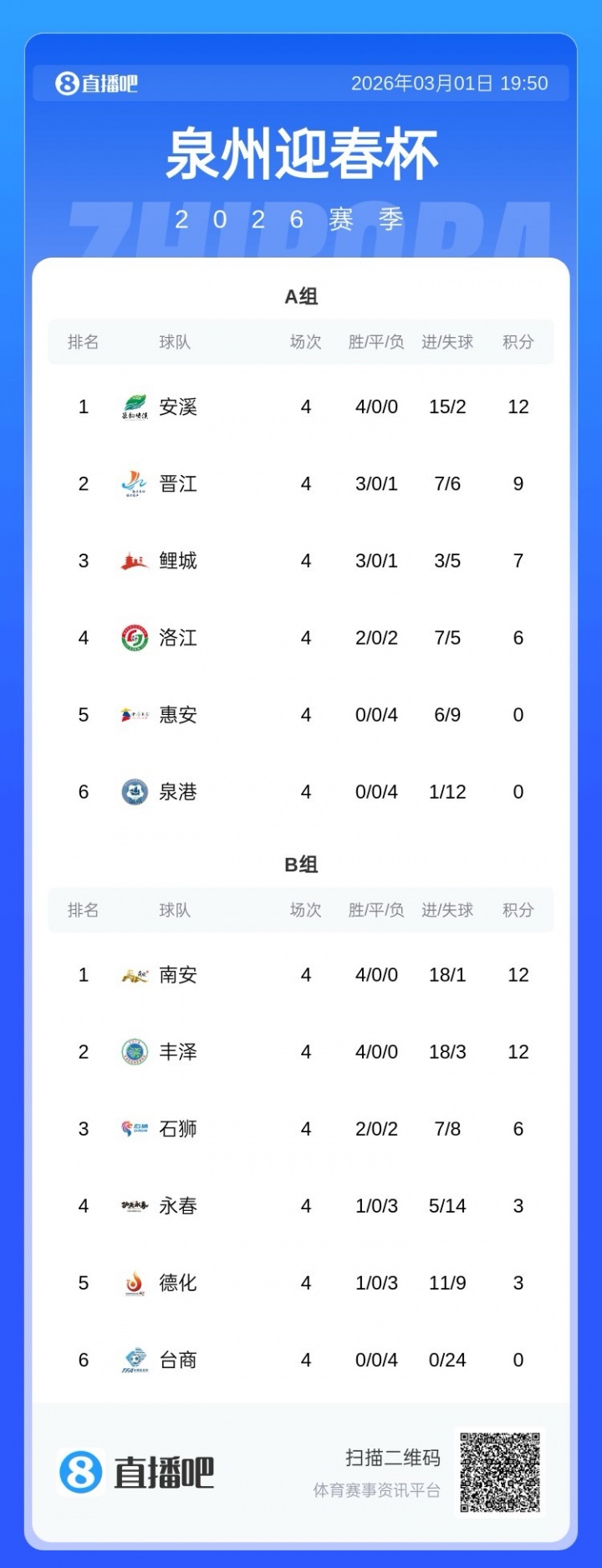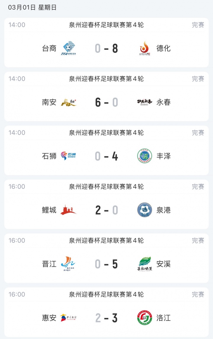 03月01日讯 泉州市首届“迎春杯”足球联赛今天结束6场比赛的争夺,德化、南安、丰泽、安溪均获得大胜,鲤城、洛江赢球,本文为大家带来每场比赛的进球动图和积分榜情况。