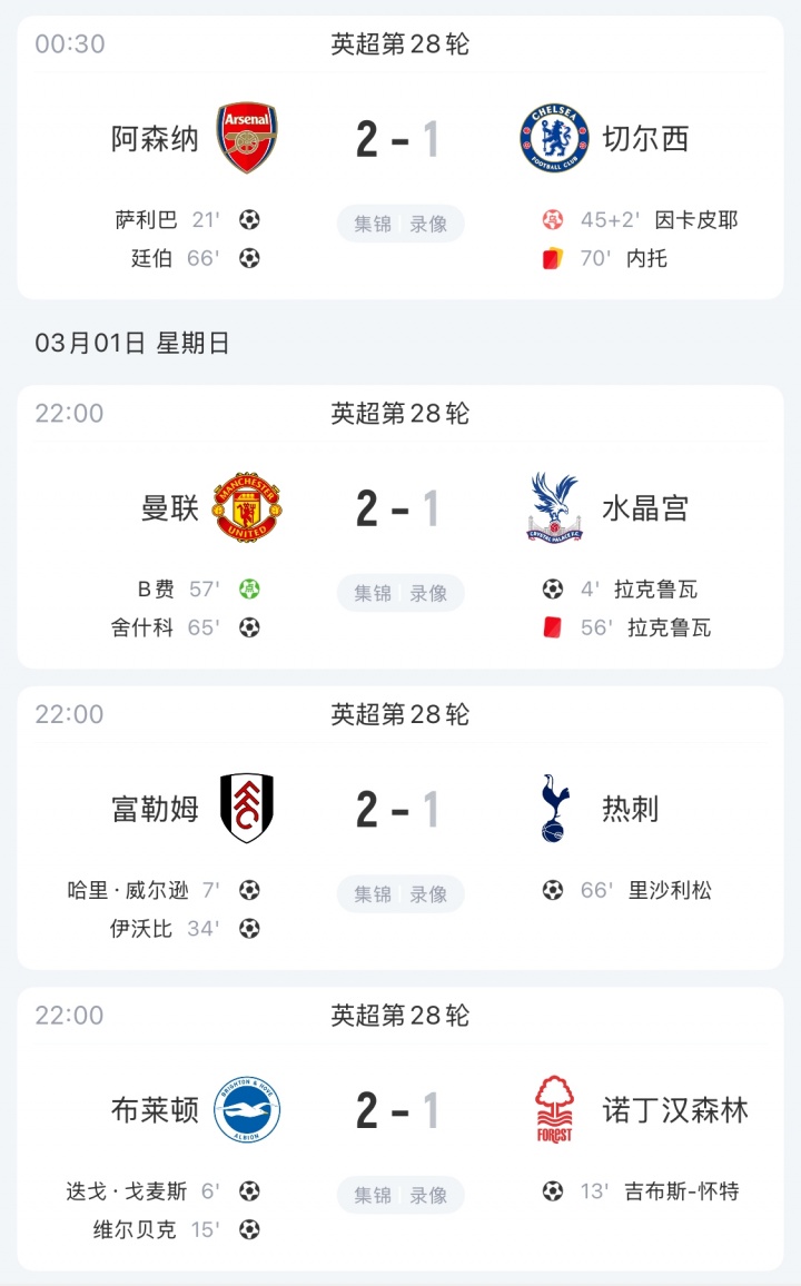 03月02日讯 英超第28轮,阿森纳2-1切尔西、曼联2-1水晶宫、富勒姆2-1热刺,布莱顿2-1诺丁汉森林,詹俊做出点评。