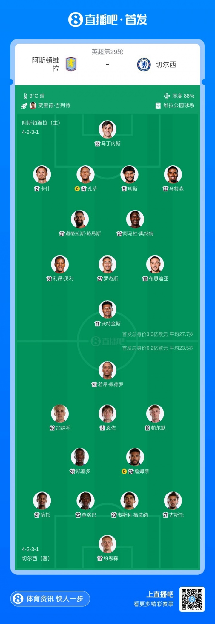 阿斯顿维拉首发:23-马丁内斯、2-卡什、4-孔萨、5-明斯、22-马特森、24-阿马杜·奥纳纳、21-道格拉斯·路易斯、31-利昂·贝利、10-布恩迪亚、27-罗杰斯、11-沃特金斯
