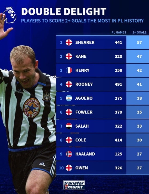 3月6日讯 德转盘点了英超历史单场至少打进2球纪录榜,其中哈兰德已经跻身前十,并且仅用时125场。以下为具体榜单:1、希勒 441场57次2、凯恩 320场47次3、亨利 258场42次4、鲁尼 491场41次5、阿圭罗 275场38次6、福勒 379场35次7、萨拉赫 322场33次8、科尔 414场30次9、哈兰德 125场27次10、欧文 326场27次