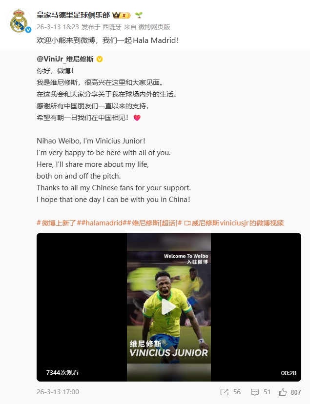 03月13日讯 皇马球星维尼修斯今天发布微博,这是他近五年来首次更新微博动态,上一条微博还是在2021年。维尼修斯在微博中表示:“感谢所有中国朋友们一直以来的支持,希望有朝一日我们在中国相见!”皇马官方微博不久后转发了这则动态并写道:“欢迎小熊来到微博,我们一起Hala Madrid!”