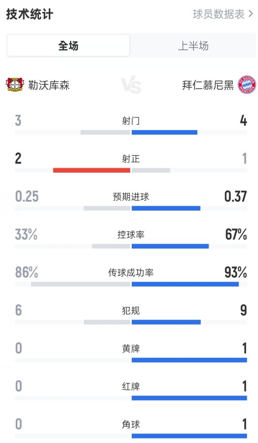 3月14日讯 德甲第26轮,勒沃库森主场迎战拜仁,半场药厂暂1-0领先。半场数据如下:射门3-4射正2-1预期进球0.25-0.37控球率33%-67%传球成功率86%-93%犯规6-9黄牌0-1红牌0-1角球0-1