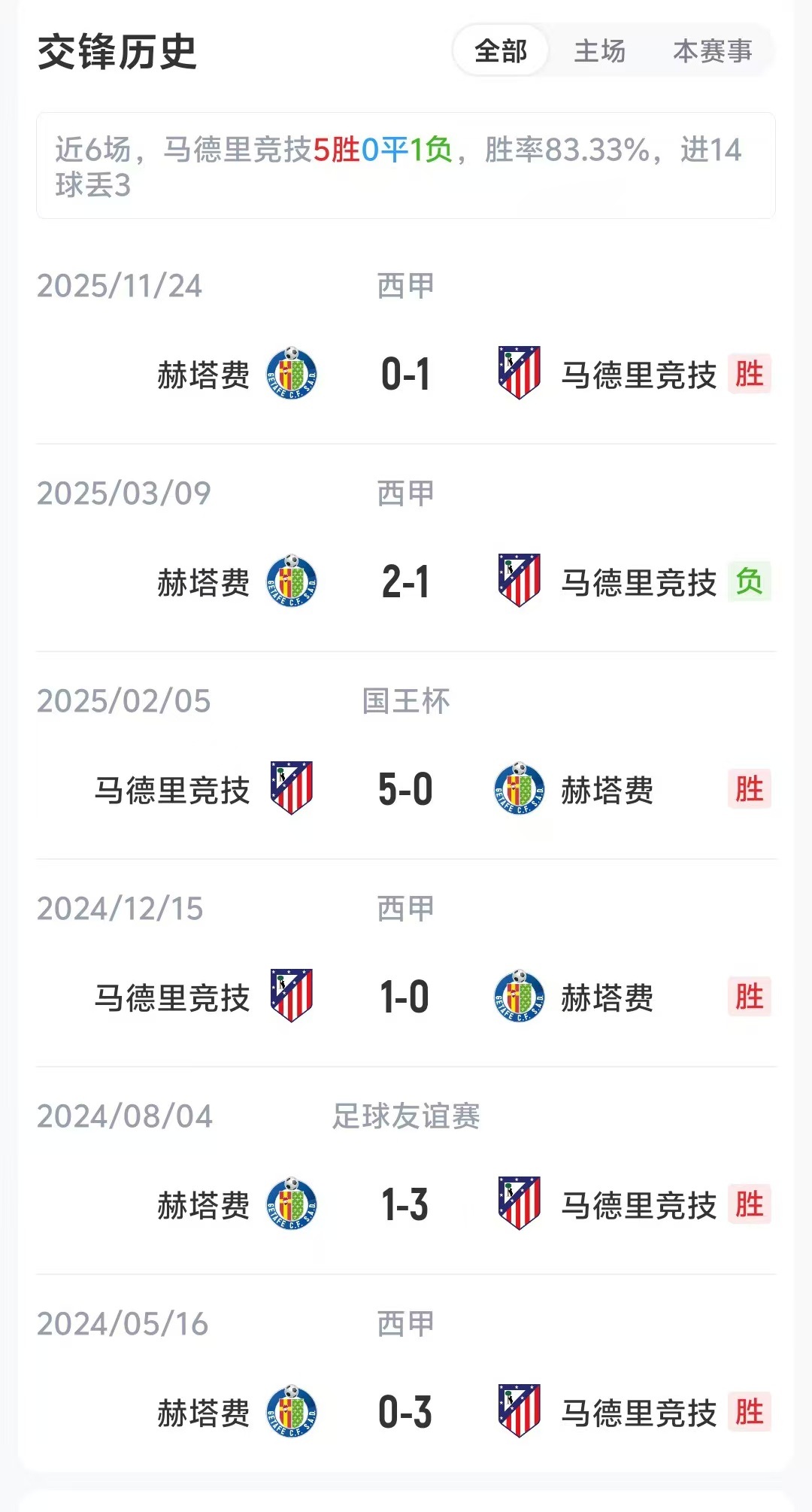 马德里竞技各项赛事4胜1负,他们近一场比赛在欧冠1/8决赛首回合主场5-2击败热刺。