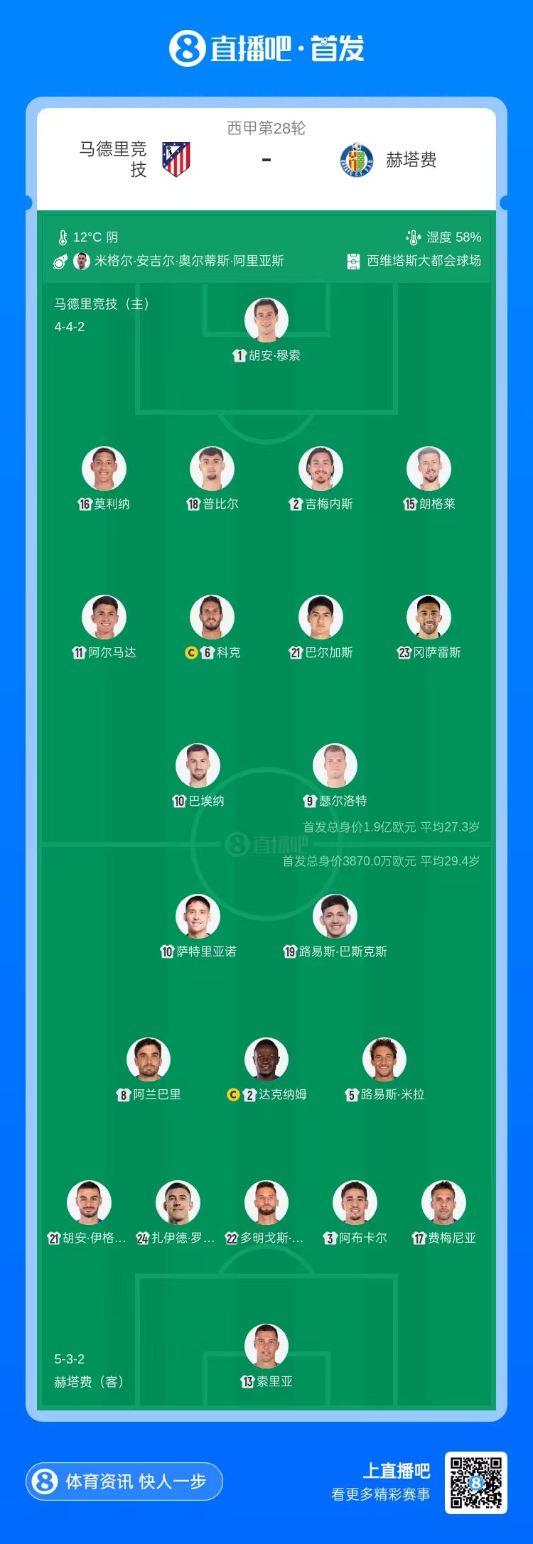马竞vs赫塔费首发:瑟尔洛特、科克先发,格列兹曼、小蜘蛛替补