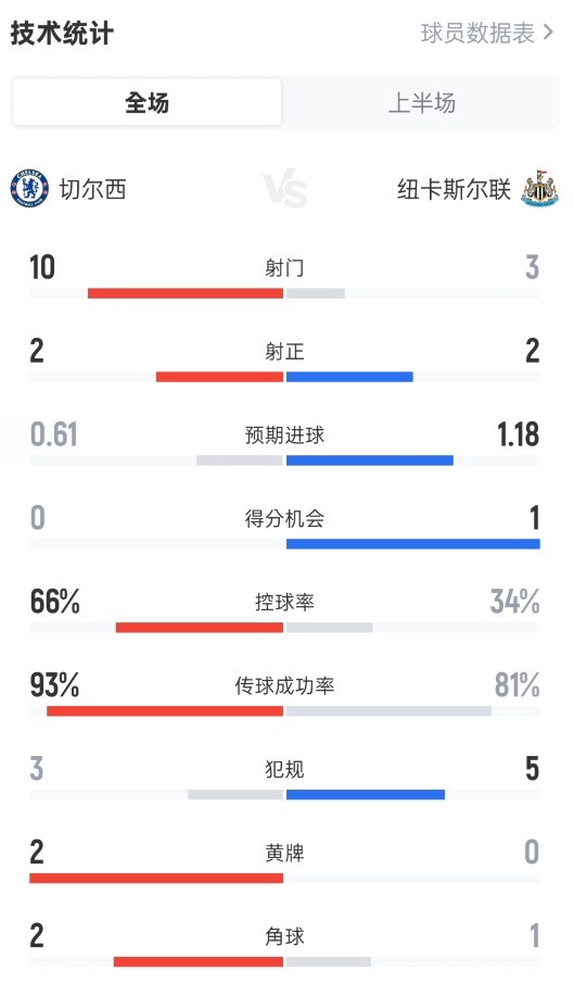 3月15日讯 英超第30轮,切尔西半场暂0-1纽卡斯尔联。半场数据如下:射门10-3射正2-2预期进球0.61-1.18进球机会0-1控球率66%-34%传球成功率93%-81%犯规3-5黄牌2-0角球2-1