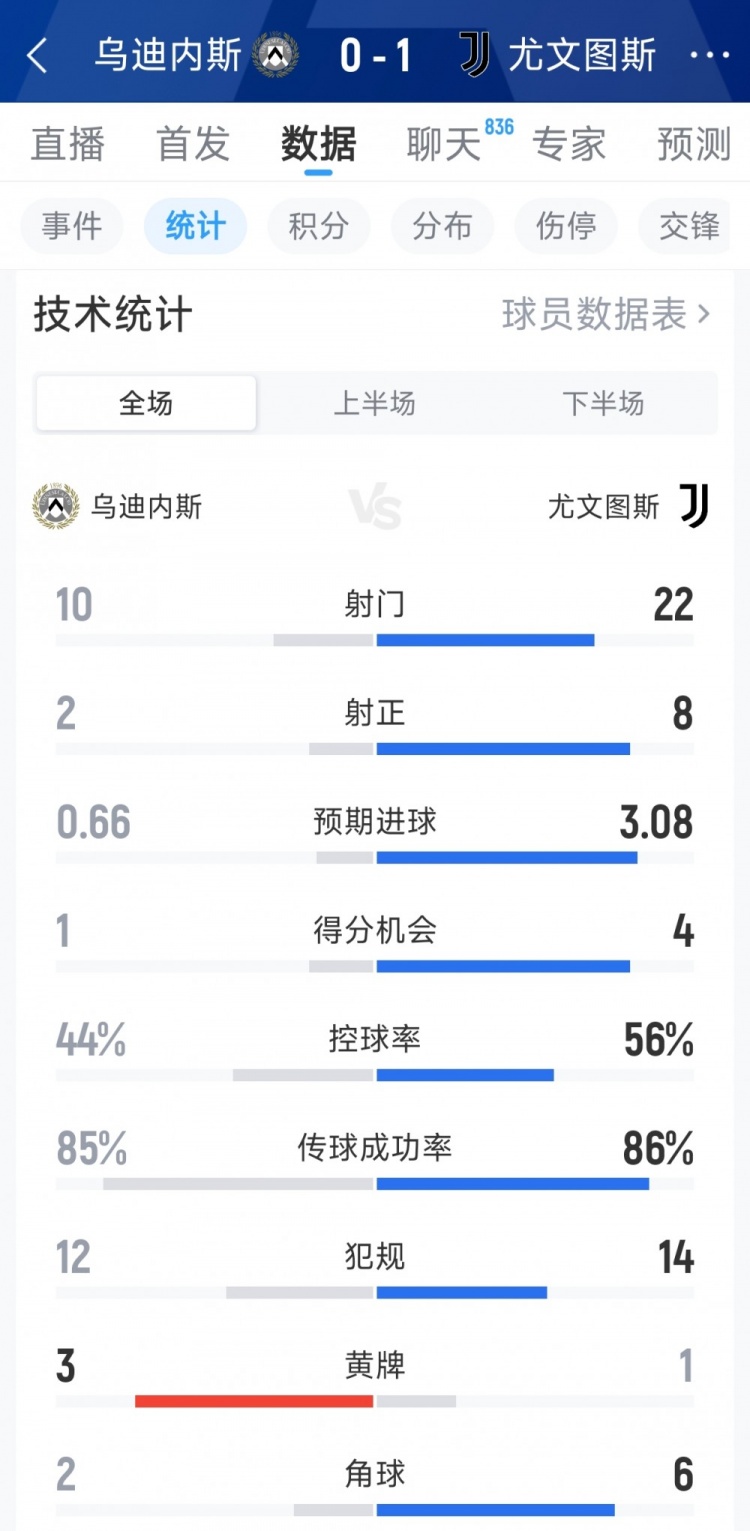 3月15日讯 在本轮意甲,尤文1-0击败乌迪内斯,以下为双方全场数据对比:乌迪内斯vs尤文射门:10-22射正:2-8预期进球:0.66-3.08得分机会:1-4控球率:44%-56%犯规:12-14黄牌:3-1角球:2-6