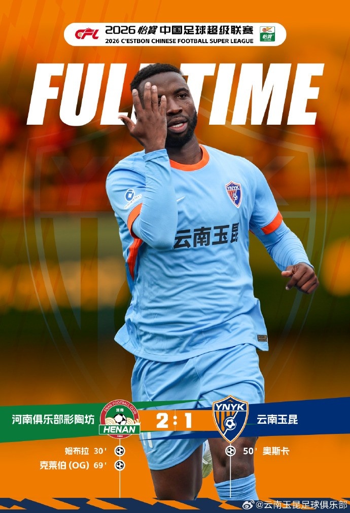 3月15日15:30,2026怡宝中超联赛第2轮,云南玉昆远赴郑州航海体育场,客场挑战河南俱乐部彩陶坊。上半场第30分钟,河南俱乐部彩陶坊取得进球,场上比分1:0。下半场第50分钟,10号约尼查禁区前头球摆渡,11号奥斯卡一蹴而就,场上比分1:1。第69分钟,河南俱乐部彩陶坊通过定位球机会取得进球,场上比分2:1。全场比赛结束,云南玉昆客场1:2河南俱乐部彩陶坊。