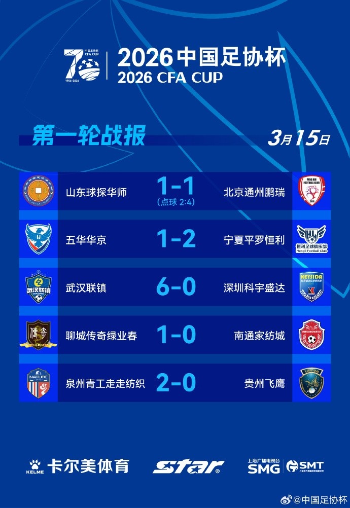 3月15日讯 2026年足协杯第一轮第三个比赛日结束,北京通州鹏瑞、宁夏平罗恒利、武汉联镇、聊城传奇绿业春、泉州青工走走纺织五支球队晋级。足协杯第一轮第三个比赛日赛果详情如下:山东球探华师 1-1(点球2-4) 北京通州鹏瑞五华华京 1-2 宁夏平罗恒利武汉联镇 6-0 深圳科宇盛达聊城川崎绿业春 1-0 南通家纺城泉州青工走走纺织 2-0 贵州飞鹰