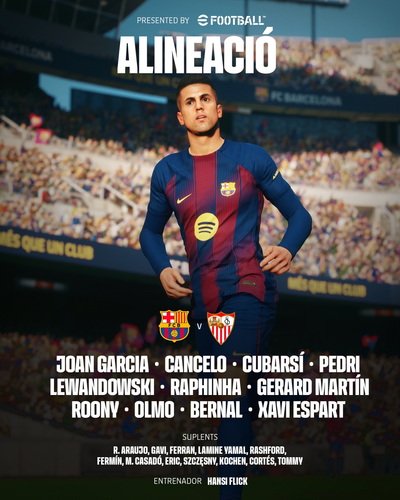 巴萨替补:25-什琴斯尼、31-迭戈·科肯、4-阿劳霍、24-埃里克·加西亚、6-加维、16-费尔明、17-卡萨多、43-托米·马奎斯、7-费兰、10-亚马尔、14-拉什福德、36-科尔特斯
