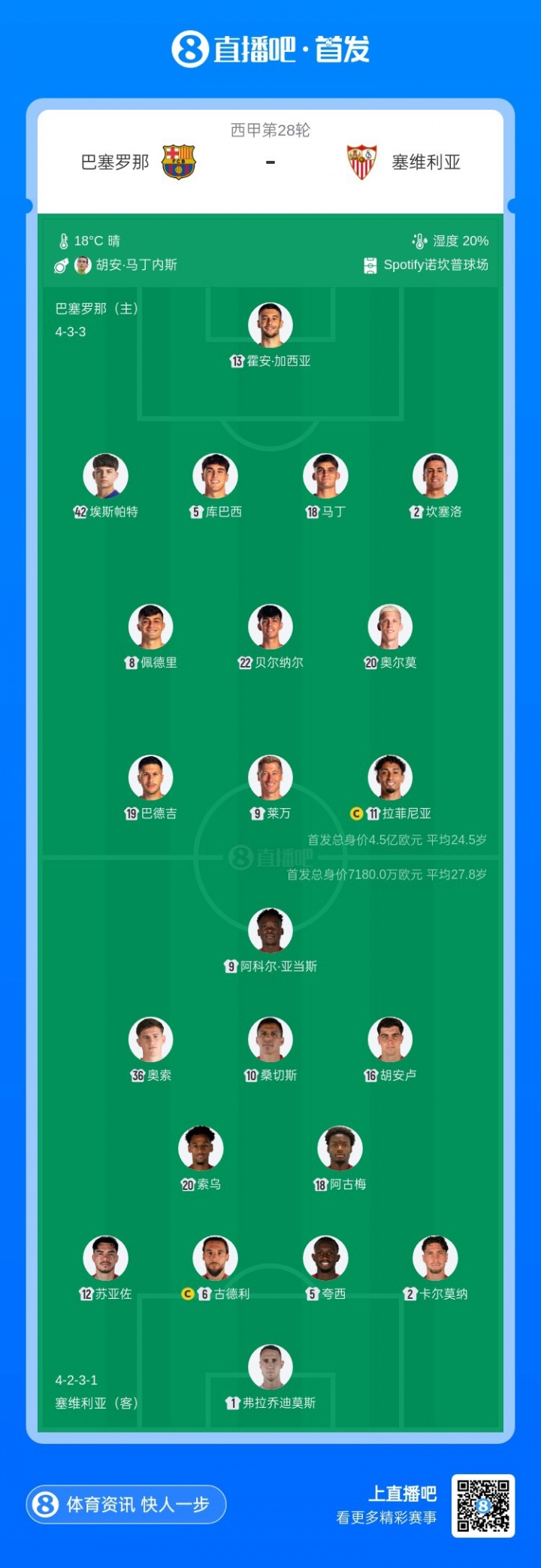 巴萨首发:13-霍安·加西亚、42-哈维·埃斯帕特、2-坎塞洛、5-库巴西、18-赫拉德·马丁、8-佩德里、22-贝尔纳尔、19-巴德吉、20-奥尔莫、9-莱万、11-拉菲尼亚