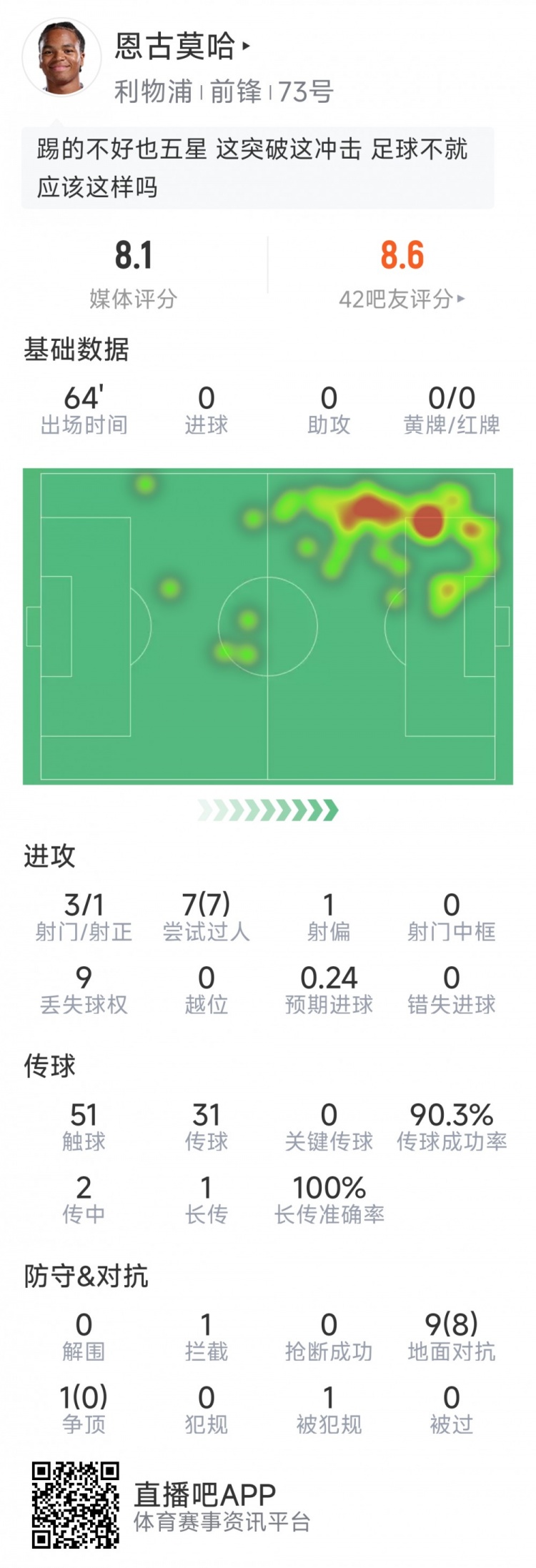 3月16日讯 在本轮英超利物浦对阵热刺的比赛中,恩古莫哈首发出场,以下为他在本场数据: