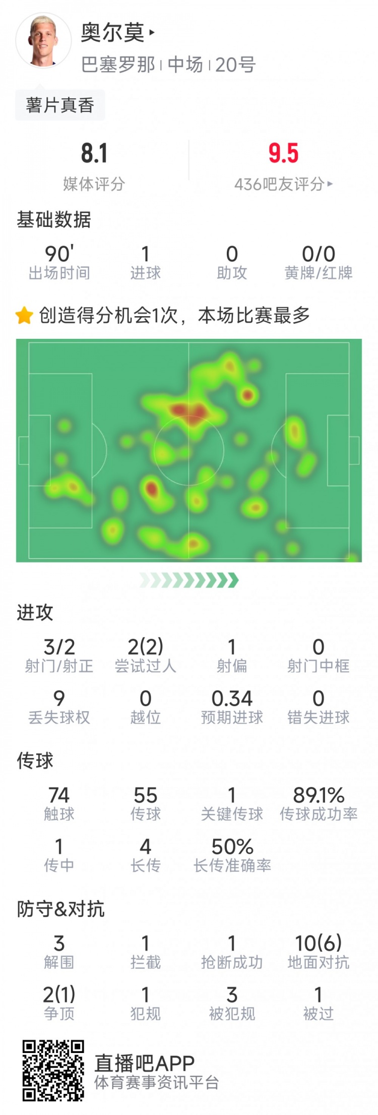 3月16日讯 在本轮西甲,巴萨5-2击败塞维利亚,以下为奥尔莫本场数据:比赛时间90分钟1粒进球3射2正2次过人成功74次触球1次关键传球传球成功率89%3次解围1次拦截1次抢断12次对抗7次成功评分8.1分
