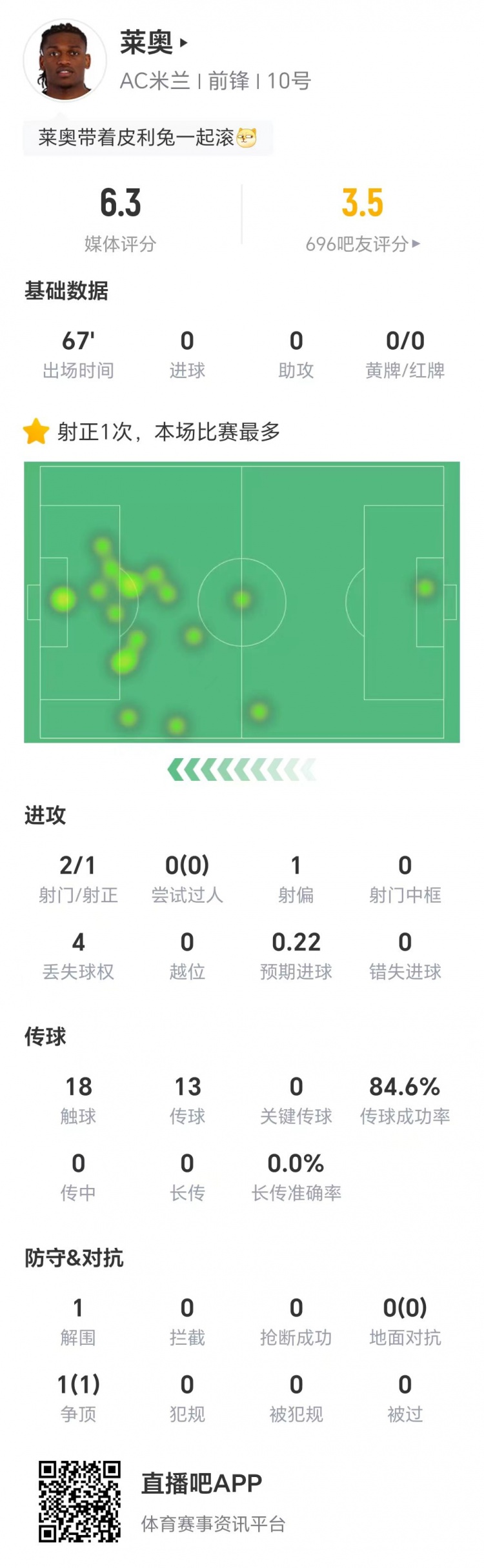 3月16日讯 意甲第29轮比赛,米兰在客场以0-1的比分不敌拉齐奥,距榜首的差距达到8分。本场比赛,红黑军团边锋莱奥表现低迷,他在第67分钟被换下。技术统计数据显示,莱奥本场比赛两射1正,无成功过人,无关键传球,无成功地面对抗,仅获评6.3分。