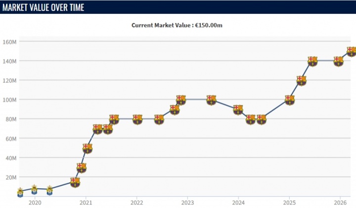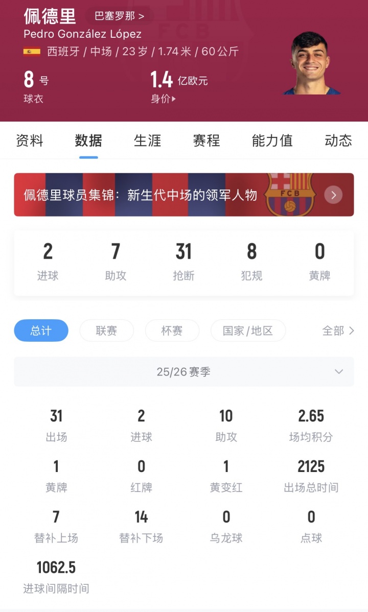 03月16日讯 德转更新西甲身价,巴萨中场佩德里身价上涨1000万欧,现升至1.5亿,与维尼修斯并列西甲第三,在中场位置上位居世界第一。佩德里现年23岁,他本赛季为巴萨出场31次,贡献2球10助,此前他的身价为1.4亿欧。
