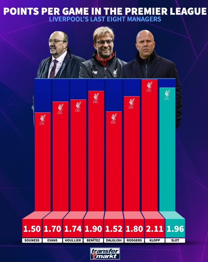 3月16日讯 德转盘点了利物浦近8位主帅在英超场均积分情况,具体如下:索内斯 1.50分埃文斯 1.70分霍利尔 1.74分贝尼特斯 1.90分达格利什 1.52分罗杰斯 1.80分克洛普 2.11分斯洛特 1.96分