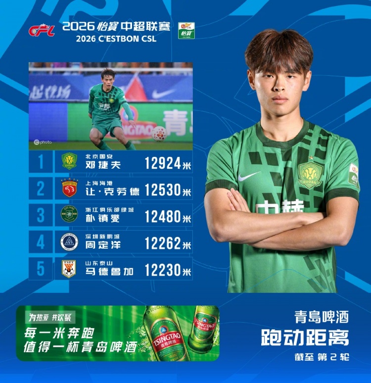 3月16日讯 今日,中超联赛官方公布了第2轮联赛跑动榜,18岁国安小将邓捷夫以12924米的跑动距离登顶跑动榜。以下为中超第2轮跑动榜Top51、邓捷夫,北京国安,12924米2、让·克劳德,上海海港,12530米3、朴镇燮,浙江队,12480米4、周定洋,深圳新鹏城,12262米5、马德鲁加,山东泰山,12230米