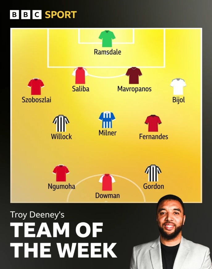 3月17日讯 英超第30轮结束,迪尼在BBC专栏评选本轮英超最佳阵容,B费、索博斯洛伊在列,恩古莫哈、道曼入围。附迪尼英超第30轮最佳阵:拉姆斯代尔(纽卡);索博斯洛伊(利物浦)、萨利巴(阿森纳)、马夫罗帕诺斯(西汉姆)、比约尔(利兹联);威洛克(纽卡)、米尔纳(布莱顿)、B费(曼联);戈登(纽卡)、恩古莫哈(利物浦)、道曼(阿森纳)主教练:埃迪·豪(纽卡)