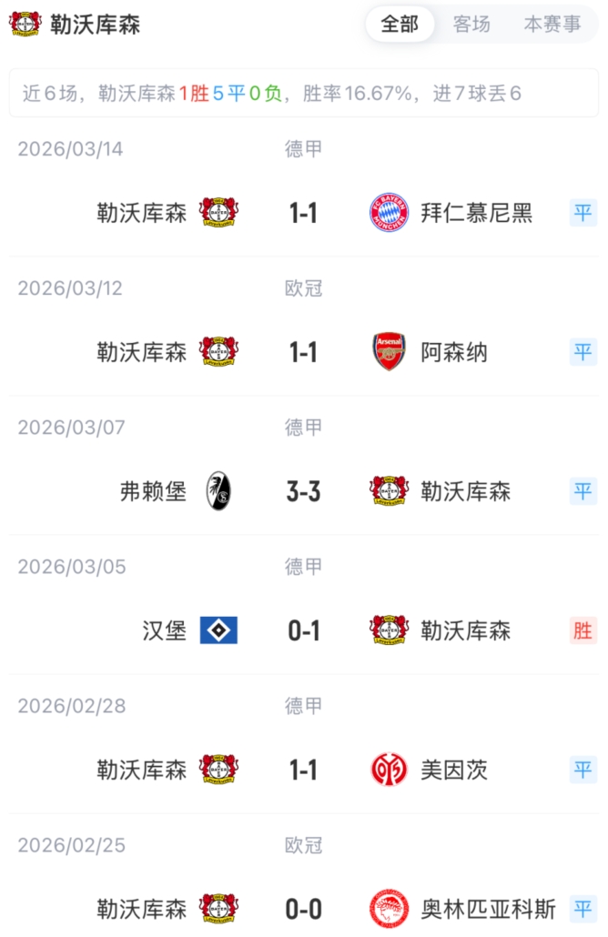 勒沃库森首发:28-布拉斯维希、4-宽萨、8-安德里希、12-塔普索巴、20-格里马尔多、24-阿莱克斯·加西亚、30-马扎、25-帕拉西奥斯、11-泰里耶、35-科法内、19-波库
