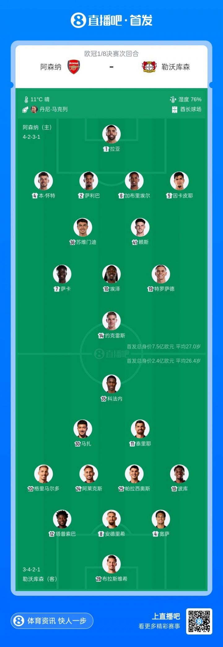 阿森纳vs勒沃库森首发:约克雷斯、萨卡、特罗萨德先发,埃泽出战