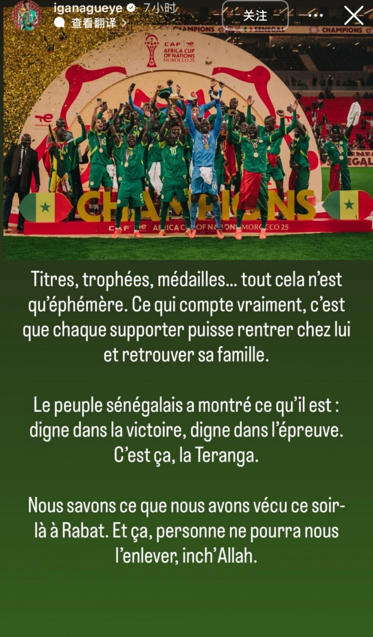 盖耶社媒:永不会忘记非洲杯夺冠之夜,没有人能夺走这段记忆