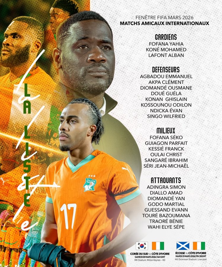 3月18日讯 科特迪瓦公布最新一期国家队名单,本月国际比赛日球队将与韩国、苏格兰交手。