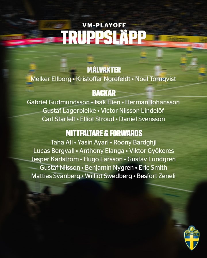 世预赛附加赛将战乌克兰,瑞典名单:约克雷斯、伊兰加在列