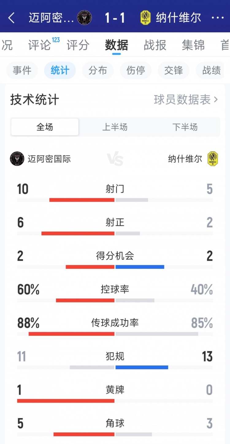 3月19日讯 在美冠杯1/8决赛次回合,迈阿密国际1-1战平纳什维尔,因客场进球劣势被淘汰,以下为双方全场数据对比:迈阿密国际vs纳什维尔射门:10-5射正:6-2得分机会:2-2控球率:60%-40%传球成功率:88%-85%犯规:11-13黄牌:1-0角球:5-3