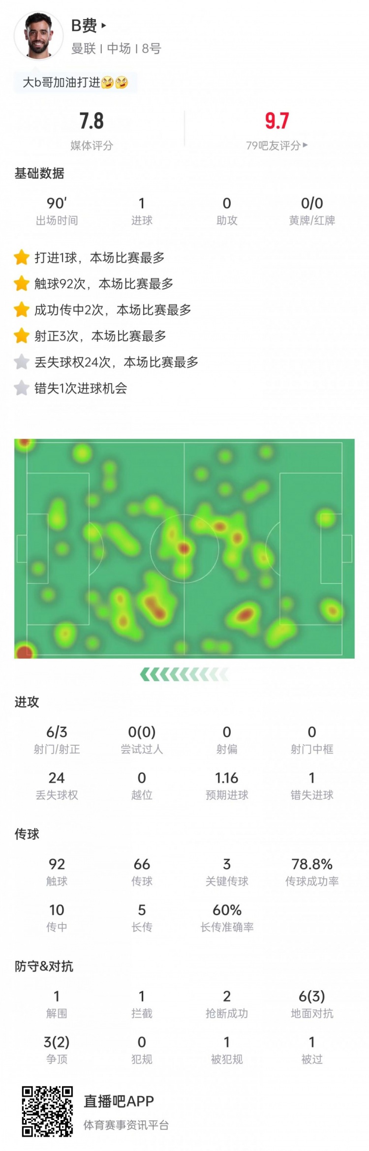 3月21日讯 英超第31轮比赛,B费点射破门+造乌龙,曼联客场2-2战平伯恩茅斯。B费本场比赛数据出场时间——90分钟进球——1射门——6(射正3)丢失球权——24预期进球——1.16错失进球——1触球——92传球——66关键传球——3传球成功率——78.8%传中——10长传——5(准确率60%)解围——1拦截——1抢断成功——2地面对抗——6(成功3)争顶——3(成功2)被犯规——1被过——1媒体评分——7.8