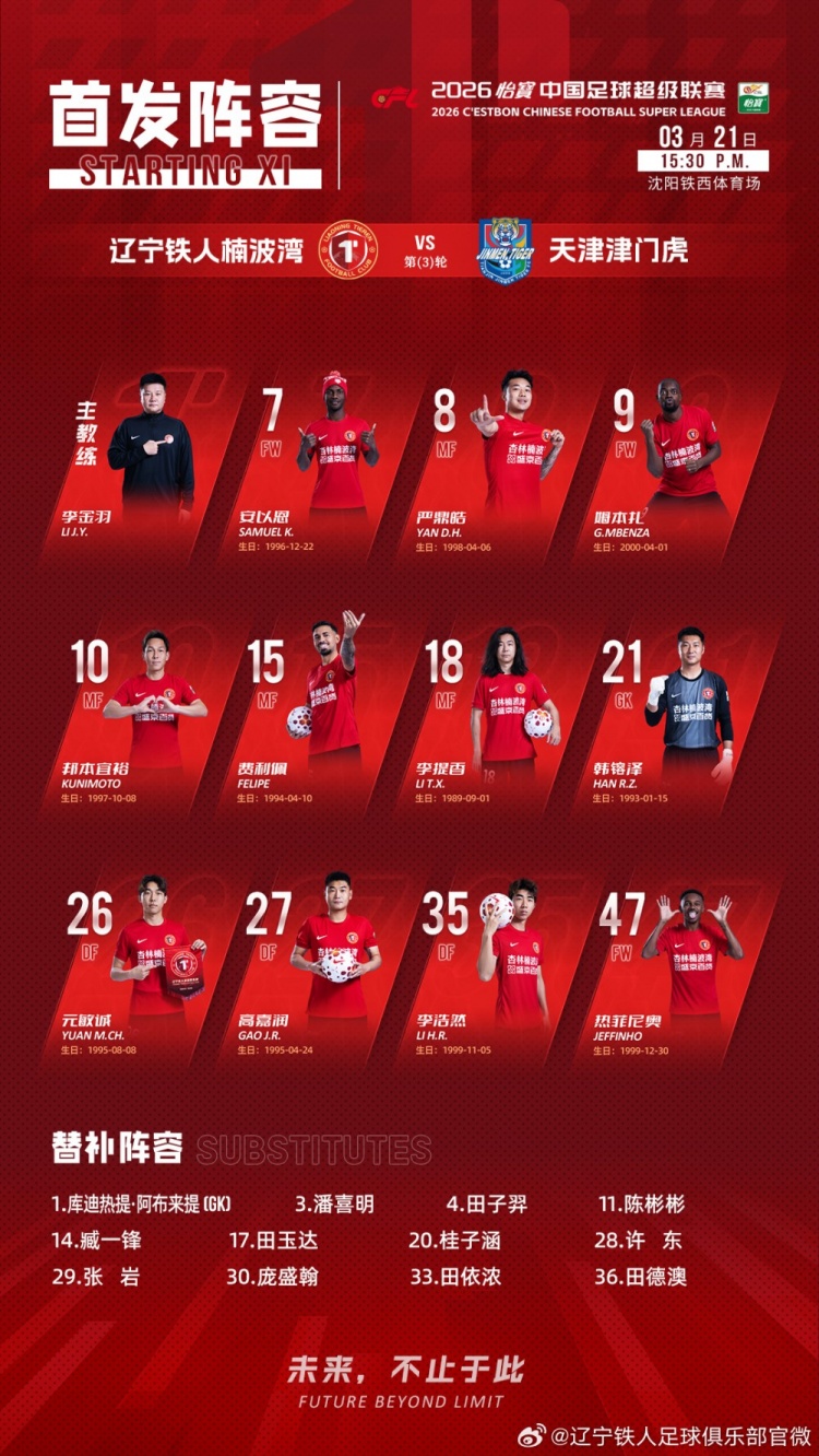3月21日15点30分,辽宁铁人楠波湾在铁西体育场对阵天津津门虎。凭借姆本扎、安以恩的运动战射门以及邦本宜裕的点球破门,辽宁铁人楠波湾主场3-0战胜天津津门虎。
