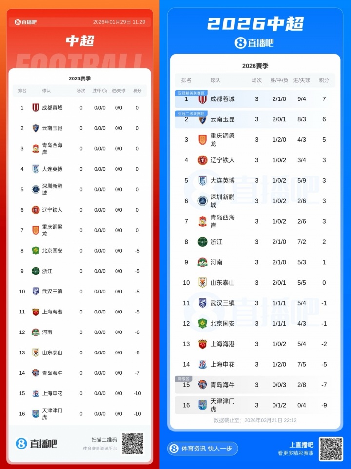 03月21日讯 中超第3轮全部结束,目前9支负分开局的球队有3队摆脱负分,6支球队仍是负分情况。