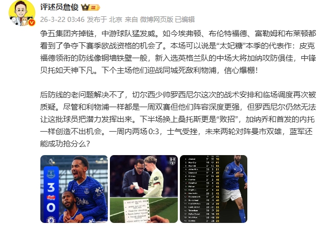 03月22日讯 本轮英超,利物浦、切尔西双双输球,詹俊发文点评了今天的比赛。